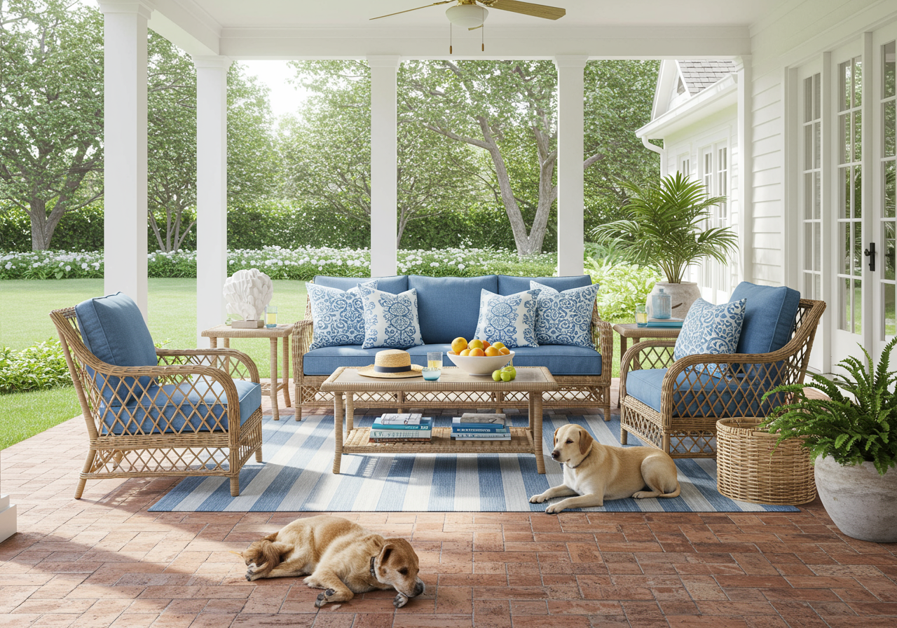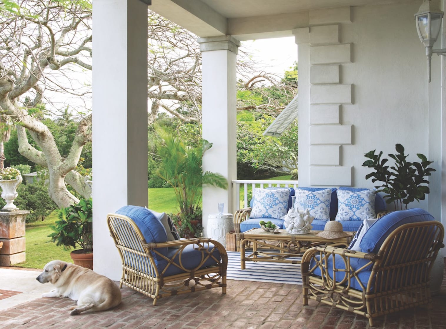 A covered porch offers a comfortable grouping of rattan furniture in vibrant blue. Photo by Tria Giovan